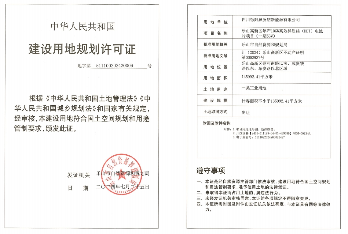 乐山高新区年产10GW高效异质结(HDT)电池片项目(一期5GW)建设用地规划许可证