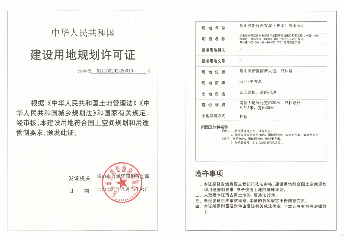 乐山国家高新区光电信息产业园基础设施及配套工程(一期)一阶段项目-南新大道(K0+008.101~K0+876.672)绿化、双林路(K0+010.191~K0+562.676)道路新建工程建设用地规划许可证