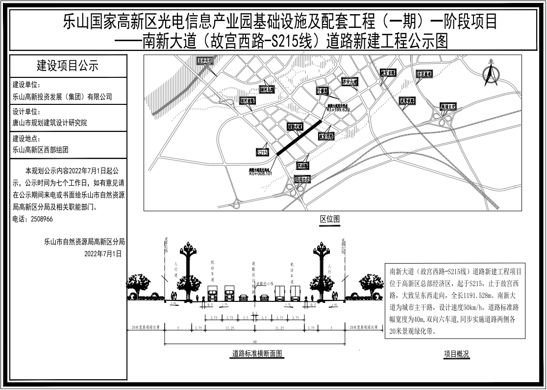 乐山国家高新区光电信息产业园基础设施及配套工程(一期)一阶段项目——南新大道(故宫西路-S215线)道路新建工程规划方案公示图