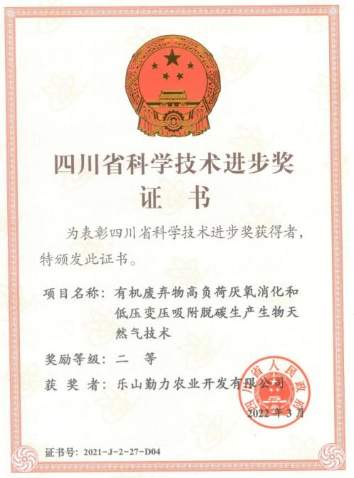 3月25日,四川省科学技术奖励大会在成都举行。乐山勤力农业有限公司与中国科学院成都生物研究所李东研究员团队共同完成“有机废弃物高负荷厌氧消化和低压变压吸附脱碳生产生物天然气技术”项目,荣获2021年度四川省科学技术进步奖二等奖,团队代表作为国家现代化建设和治蜀兴川作出杰出贡献的科技工作者登上领奖台。