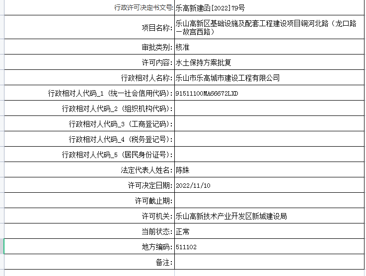 乐山高新区新城建设局关于乐山高新区基础设施及配套工程建设项目铜河北路(龙口路—故宫西路)项目许可证