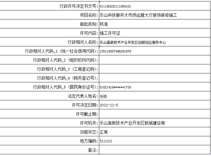 乐山高新区新城建设局关于乐山科技服务大市场运营大厅装饰装修施工的施工许可证
