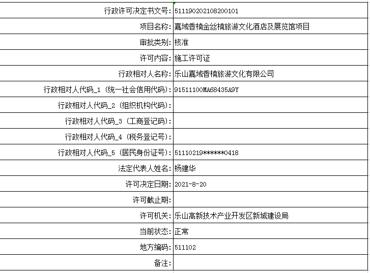 乐山高新区新城建设局关于嘉域香楠金丝楠旅游文化酒店及展览馆项目的行政许可