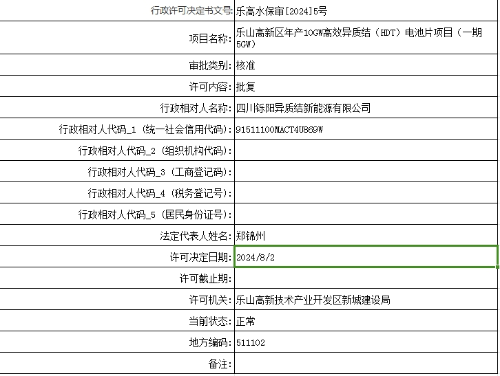 乐山高新区年产10GW高效异质结(HDT)电池片项目(一期5GW)
