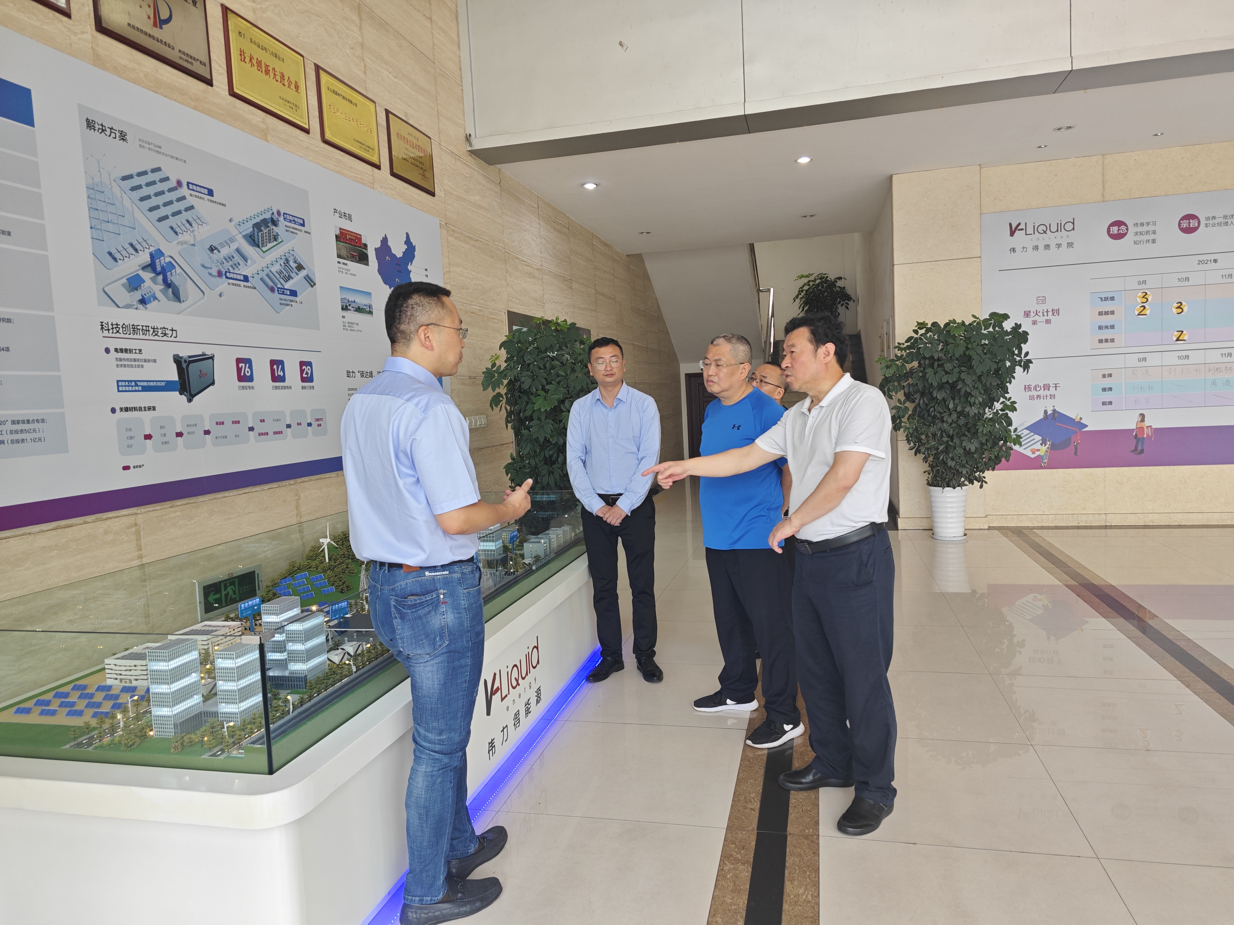 考察组实地参看了企业全钒液流电池储能系统智能生产线,详细了解了全钒液流电池电堆组装系统以及电堆封装工艺技术优势、全钒液流电池储能行业现状、钒矿资源、产业布局和商业模式等情况。
