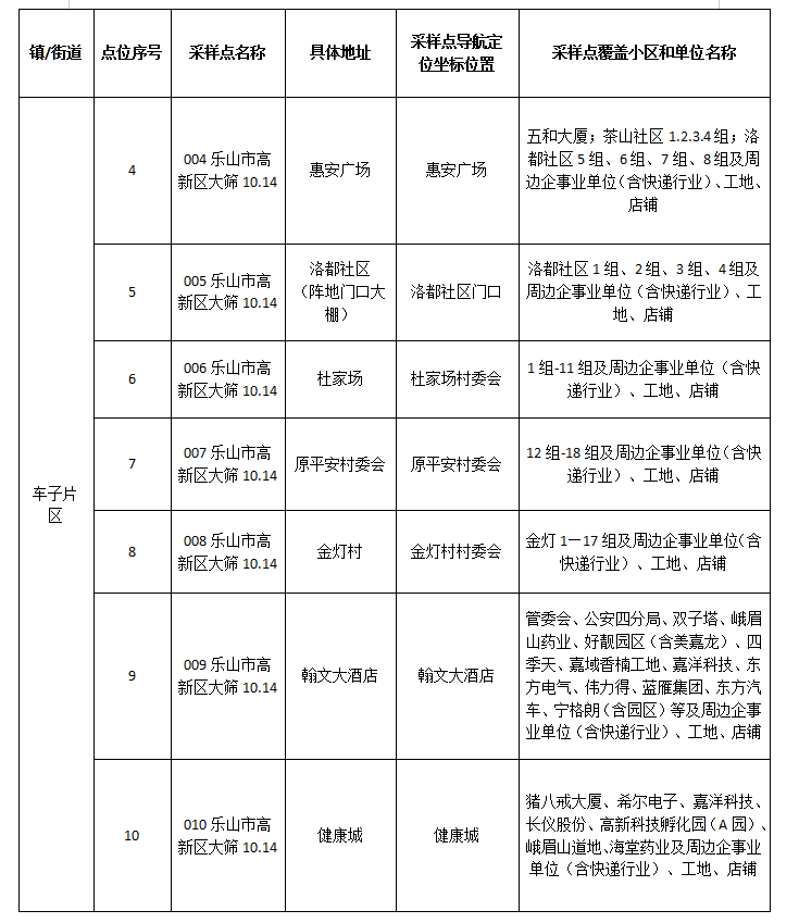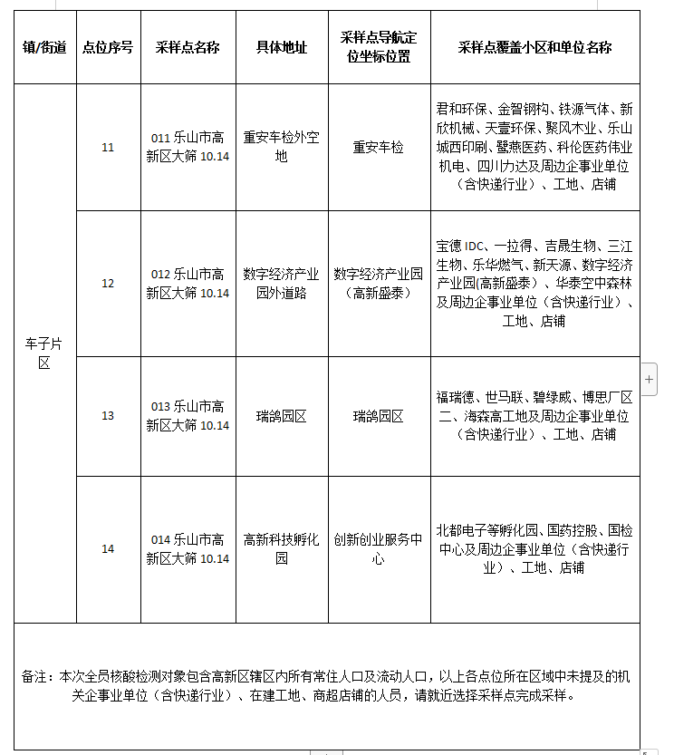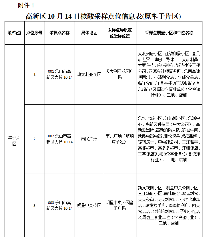 附件:1.高新区10月14日核酸采样点位信息表(原车子片区)