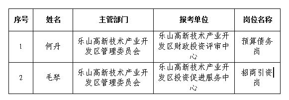 根据《关于2023年乐山高新区管委会直属事业单位公开考核招聘工作人员的公告》,经资格初审、笔试、资格复审、面试、体检、考察等环节,何丹等2人作为2023年乐山高新区管委会直属事业单位公开考核招聘工作人员拟聘用人员,现进行公示。