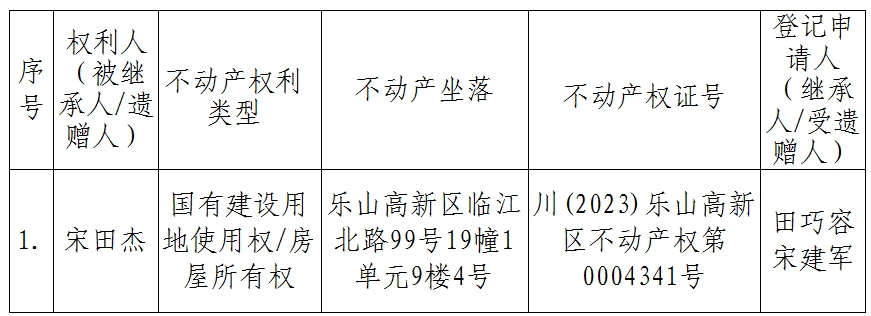 根据《不动产登记暂行条例实施细则》第十四条的规定,经初步查验,不动产登记机构拟对下列不动产权利办理不动产继承登记。根据《不动产登记暂行条例实施细则》第十七条的规定,现予公告。如有异议,请自本公告之日起十五个工作日内,将异议书面材料送达不动产登记机构。逾期无人提出异议或者异议不成立的,不动产登记机构将予以登记。