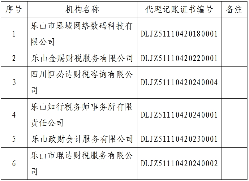 根据《中华人民共和国会计法》《代理记账管理办法》和四川省财政厅的统一安排,乐山高新区财政局开展了2024年度代理记账机构年度备案工作,对2024年12月31日前已取得代理记账资格的代理记账机构进行了年度备案,现将通过年度备案的代理记账机构名单公示如下。
