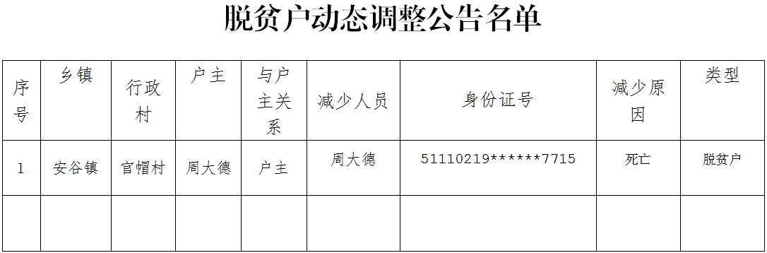 根据《扶贫开发建档立卡工作方案》要求,我区对2025年4月死亡的1名脱贫人口进行了审核,并按照规定的方法和办理程序。同意对2025年4月死亡的1名脱贫人口进行动态减少(名单附后),现予以公告。