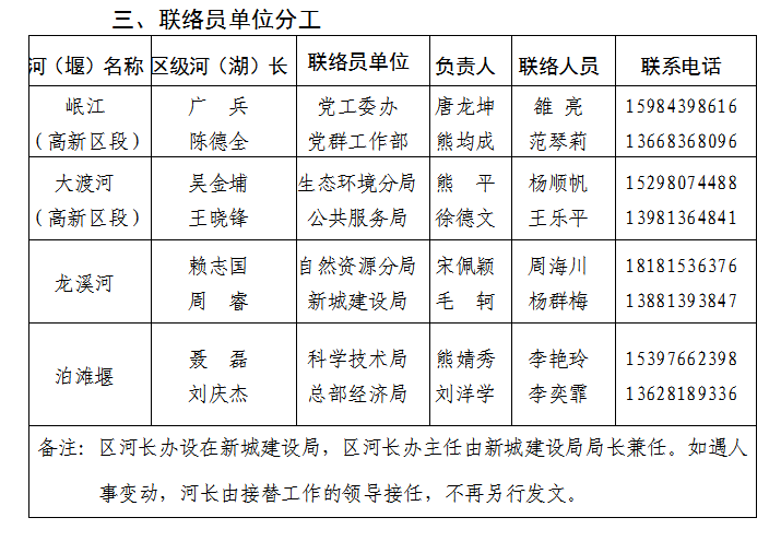 因管委会人事变动,经区总河长办公室领导同意,对区级河(湖)长、总河长办公室成员单位及联络员单位分工进行调整,现印发你们,请遵照执行。
