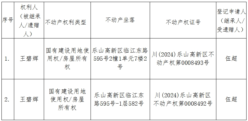 根据《不动产登记暂行条例实施细则》第十四条的规定,经初步查验,不动产登记机构拟对下列不动产权利办理不动产继承登记。根据《不动产登记暂行条例实施细则》第十七条的规定,现予公告。如有异议,请自本公告之日起十五个工作日内,将异议书面材料送达不动产登记机构。逾期无人提出异议或者异议不成立的,不动产登记机构将予以登记。