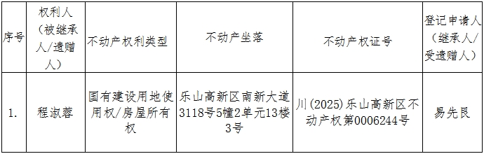 根据《不动产登记暂行条例实施细则》第十四条的规定,经初步查验,不动产登记机构拟对下列不动产权利办理不动产继承登记。根据《不动产登记暂行条例实施细则》第十七条的规定,现予公告。如有异议,请自本公告之日起十五个工作日内,将异议书面材料送达不动产登记机构。逾期无人提出异议或者异议不成立的,不动产登记机构将予以登记。