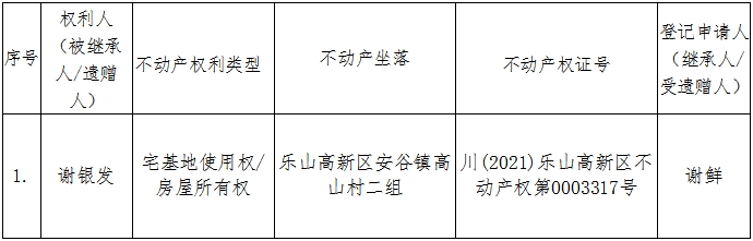 根据《不动产登记暂行条例实施细则》第十四条的规定,经初步查验,不动产登记机构拟对下列不动产权利办理不动产继承登记。根据《不动产登记暂行条例实施细则》第十七条的规定,现予公告。如有异议,请自本公告之日起十五个工作日内,将异议书面材料送达不动产登记机构。逾期无人提出异议或者异议不成立的,不动产登记机构将予以登记。