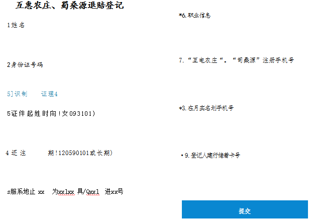 填报姓名、有效身份证号码及有效期、联系地址、职业信息、手机号码(“互惠农庄”、“蜀桑源”平台注册手机号码及在用实名制手机号码)、登记人本人的中国建设银行储蓄卡号。集资人已死亡的,继承人除登记上述信息外,还需联系隆昌市人民法院并提供继承人身份证、继承权公证文书和开立在继承人名下的银行账户。
