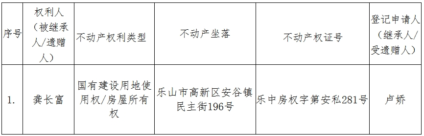 根据《不动产登记暂行条例实施细则》第十四条的规定,经初步查验,不动产登记机构拟对下列不动产权利办理不动产继承登记。根据《不动产登记暂行条例实施细则》第十七条的规定,现予公告。如有异议,请自本公告之日起十五个工作日内,将异议书面材料送达不动产登记机构。逾期无人提出异议或者异议不成立的,不动产登记机构将予以登记。