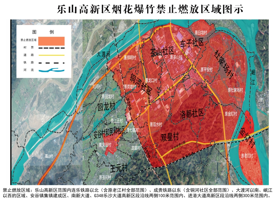 一、全时段禁止燃放区域:高新区范围内连乐铁路以北(含原老江村全部范围)、成贵铁路以东(含铜河社区全部范围)、大渡河以南、岷江以西的区域、安谷镇集镇建成区、南新大道、G348乐沙大道高新区段沿线两侧100米范围内、进港大道高新区段沿线两侧300米范围内。