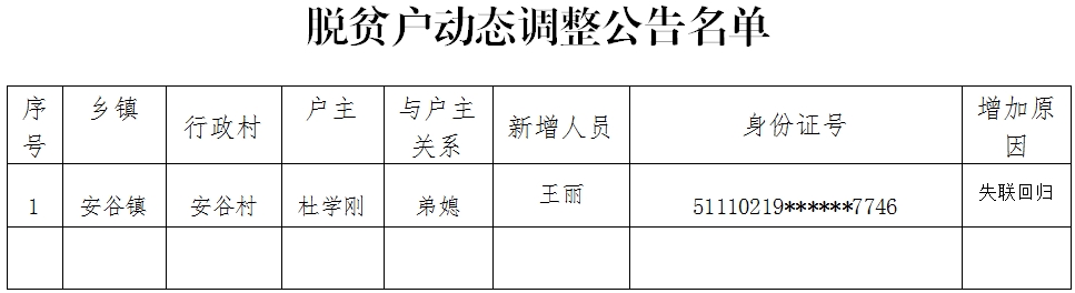 根据《扶贫开发建档立卡工作方案》要求,我区对2024年11月失联回归的1名人口进行了审核,并按照规定的方法和办理程序。同意对2024年11月失联回归人员新增为脱贫人口(名单附后),现予以公告。