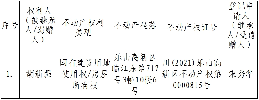 根据《不动产登记暂行条例实施细则》第十四条的规定,经初步查验,不动产登记机构拟对下列不动产权利办理不动产继承登记。根据《不动产登记暂行条例实施细则》第十七条的规定,现予公告。如有异议,请自本公告之日起十五个工作日内,将异议书面材料送达不动产登记机构。逾期无人提出异议或者异议不成立的,不动产登记机构将予以登记。