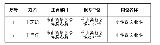 根据《乐山高新区2023年下半年赴西南大学公开考核招聘教师的公告》,经资格审核、面试、体检、考察等环节,王芝语、丁佳仪等2人作为乐山高新区2023年下半年赴西南大学考核招聘教师拟聘用人员,现进行公示。